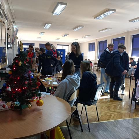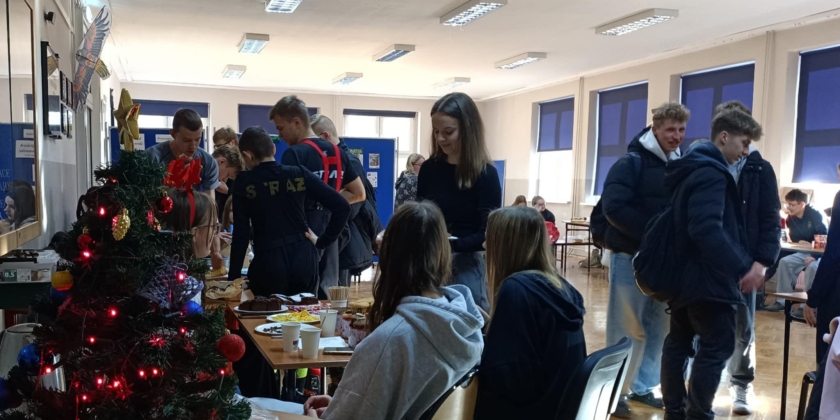 Jak co roku przed Świętami Bożego Narodzenia Samorząd Uczniowski zaprasza na słodkie co nieco, czyli kiermasz świąteczny. W tym roku tradycji również stało się zadość. Uczniowie liceum i technikum przygotowali w szkolnej auli stoiska klasowe, na których można było kupić pyszne domowe ciasta, pachnące pierniczki i muffinki oraz wypić zimową herbatę z pomarańczami albo cappuccino z cynamonem. W tle brzmiały znane świąteczne przeboje, a aula na każdej przerwie była wypełniona uczniami i nauczycielami Większość słodkich smakołyków znikła bardzo szybko. Dochód z kiermaszu przeznaczymy na cele charytatywne. Dziękujemy wszystkim biorącym udział w naszym świątecznym kiermaszu