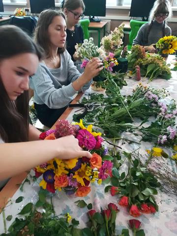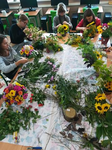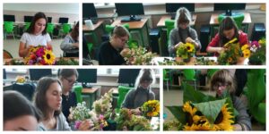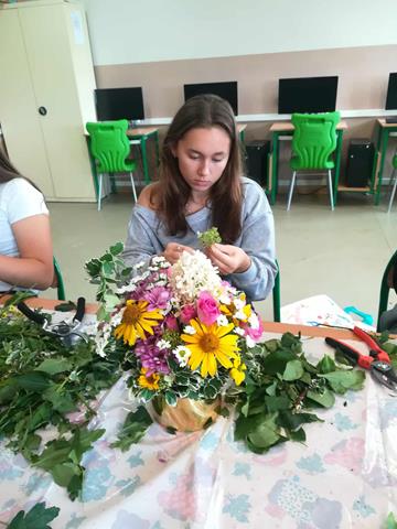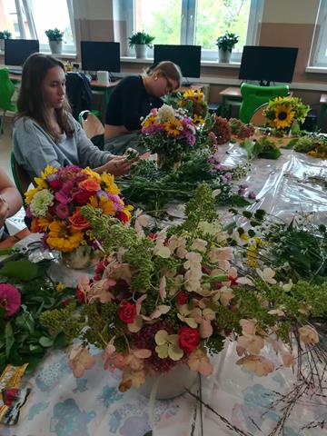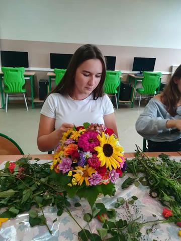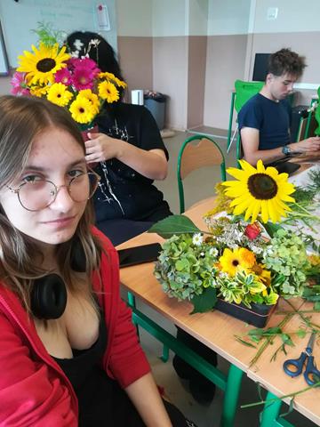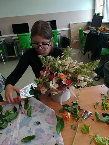 Uczniowie klasy 3TA, uczący się w zawodzie technik architektury krajobrazu, pod kierunkiem p. Aleksandry Błaszczyk po raz kolejny mogli wykazać się swoim talentem oraz umiejętnościami, wykonując kompozycje tematycznie związane z jesienią.Młodzież mogła zweryfikować i utrwalić swoją wiedzę dotyczącą przygotowania warsztatu pracy, wyboru kwiatów oraz roślin do wykonania własnej kompozycji. Wiadomości zdobyte podczas takiej niezwykłej lekcji są bardzo cenne w świetle świadomości ekologicznej i stanowią praktyczne przygotowanie do egzaminu zawodowego, toteż młodzież z zainteresowaniem oraz uwagą uczestniczyła w zorganizowanych dla nich zajęciach.