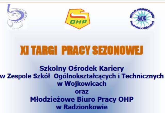 Szkolny Ośrodek Kariery działający w Zespole Szkół Ogólnokształcących i Technicznych w Wojkowicach oraz Młodzieżowe Biuro Pracy w Radzionkowie, serdecznie zapraszają do aktywnego udziału w Targach Pracy Sezonowej skierowanych do osób…