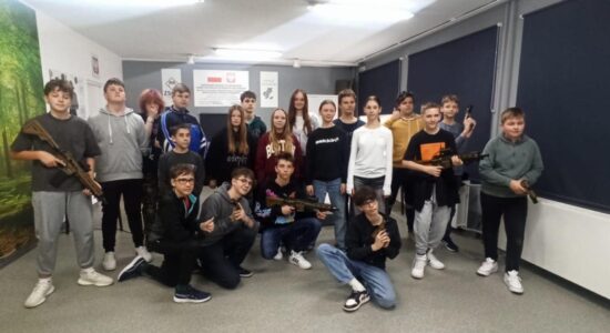 Uczniowie zaprzyjaźnionych szkół podstawowych z Rogoźnika, Dąbia i Mierzęcic podczas pierwszych zajęć na wirtualnej strzelnicy w naszej szkole