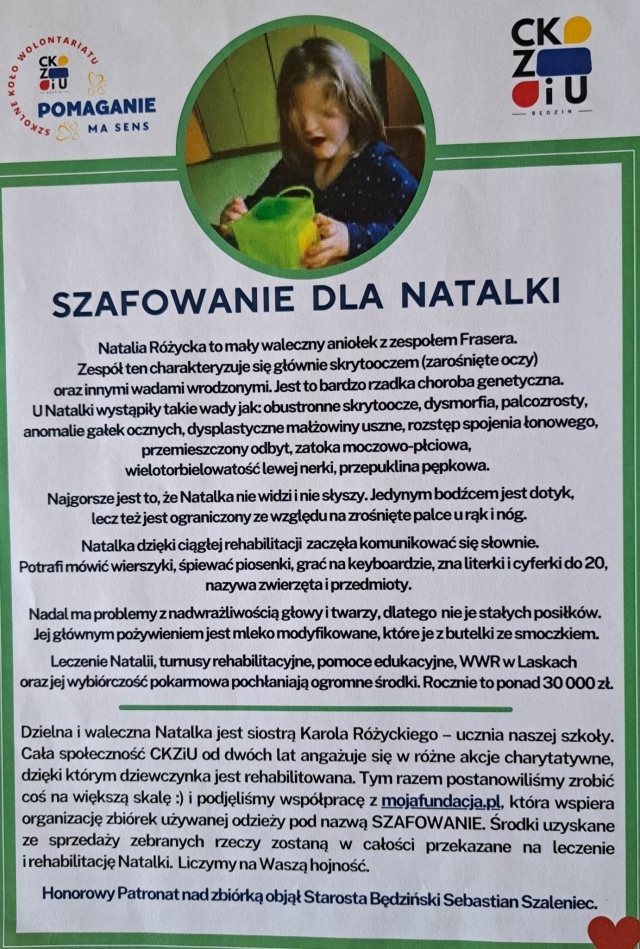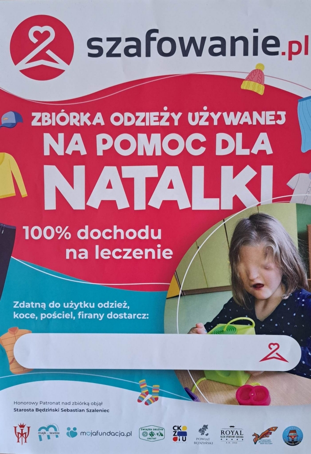 Tym razem włączamy się w akcję organizowaną przez CKZiU w Będzinie, pod honorowym patronatem Starosty Będzińskiego Sebastiana Szaleńca „Szafowanie dla Natalki”!