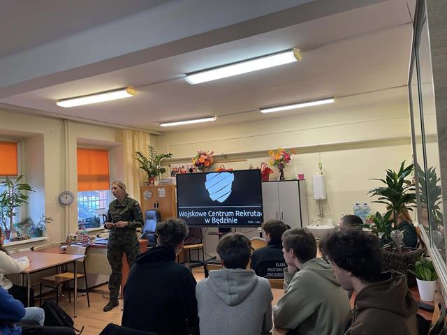16 stycznia uczniowie naszej szkoły wzięli udział w prelekcji na temat kwalifikacji wojskowej, poprowadzonej przez st. szer. spec. Annę Starczynowską z WCR w Będzinie. Uczniowie dowiedzieli się, kogo dotyczy kwalifikacja do służby i na czym polega.